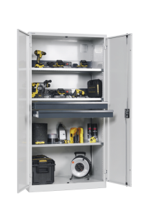 Akku-Ladeschränke mit Flügeltüren: Die Schränke sind je nach Modell ausgestattet mit: Verstellböden verzinkt, 30 mm stark, Tragkraft 60 kg. Schubladen lackiert, Anthrazitgrau (RAL 7016), Tragkraft 50 kg. Energieleisten mit Ein-/Aus-Schalter und 4 bzw. 5 Steckdosen 230 V.