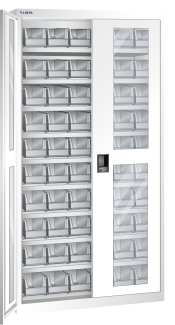 Behälterschrank mit 2 Sichtfenster-Türen Scharnierlagerung (BxTxH) 1000x300x1950mm 9 Verstellböden, 60 Lagersichtbehälter KEY Lock Reinweiss RAL 9010