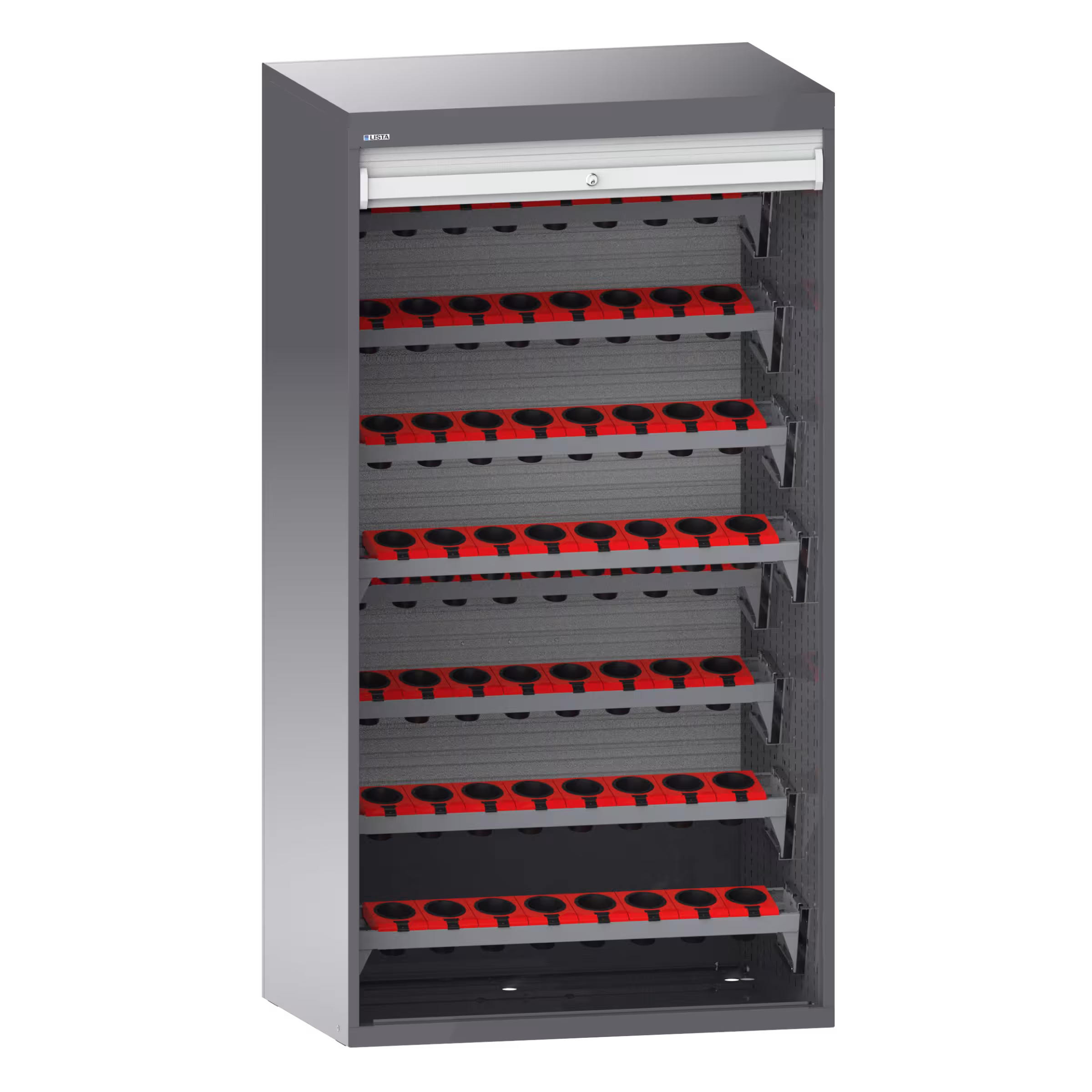 NC-Schrank mit Rollladen 54x27E (BxTxH) 1038x691x1950mm 8 Werkzeugwechselrahmen, 64 Halter ISO-SK 50 KEY Lock Grau metallic NCS S 6502-B