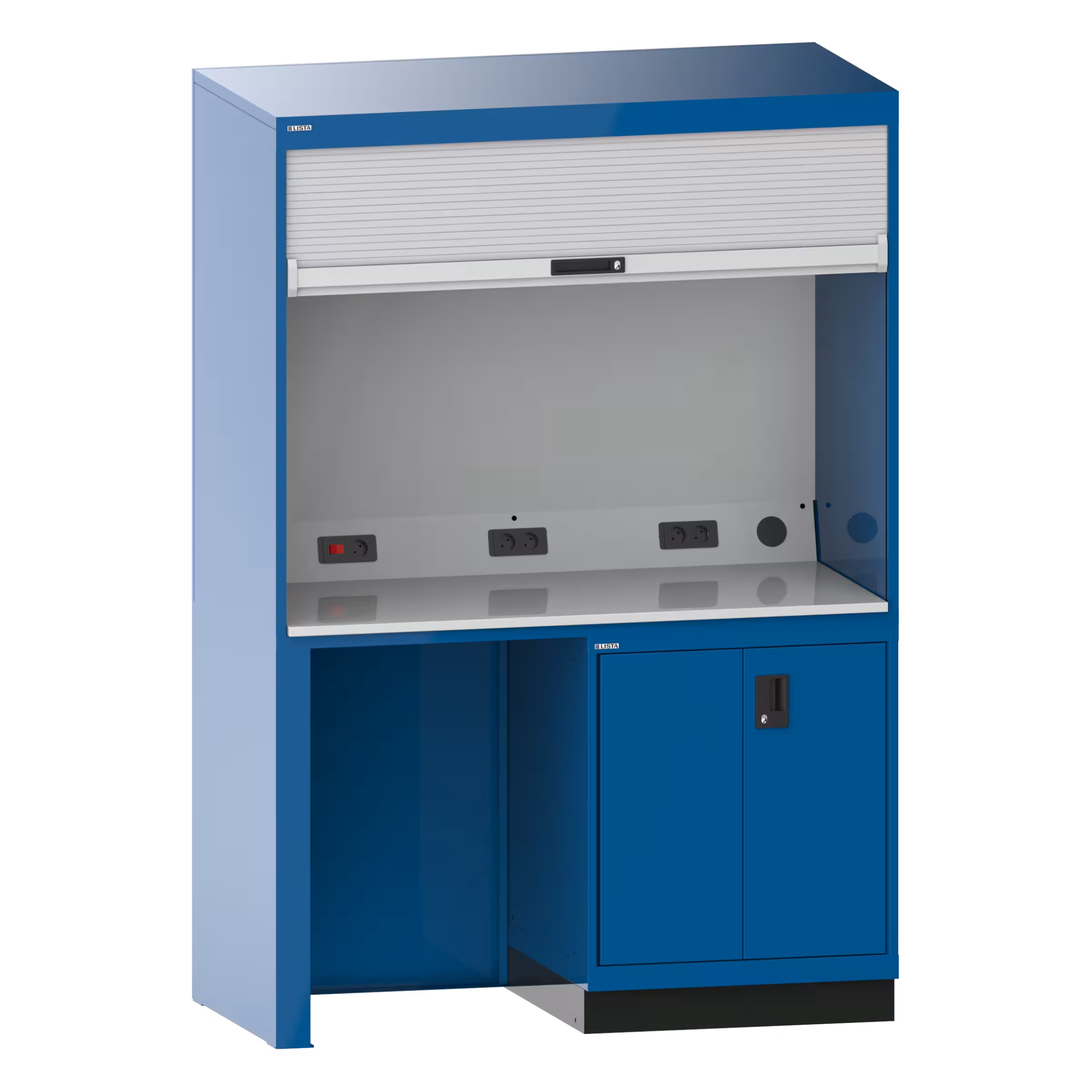 Qualityschrank: Mit Kunststoff-Rollladen inkl. Zylinderschloss, Anschlusskabel 3 m lang, Hartlaminatplatte als Arbeitsfläche, werkzeuglos eingelegt, Elektrifizierung mit 4-fach oder 5-fach Steckdose sowie Kippschalter für die im Gehäusedeckel montierte Leuchte