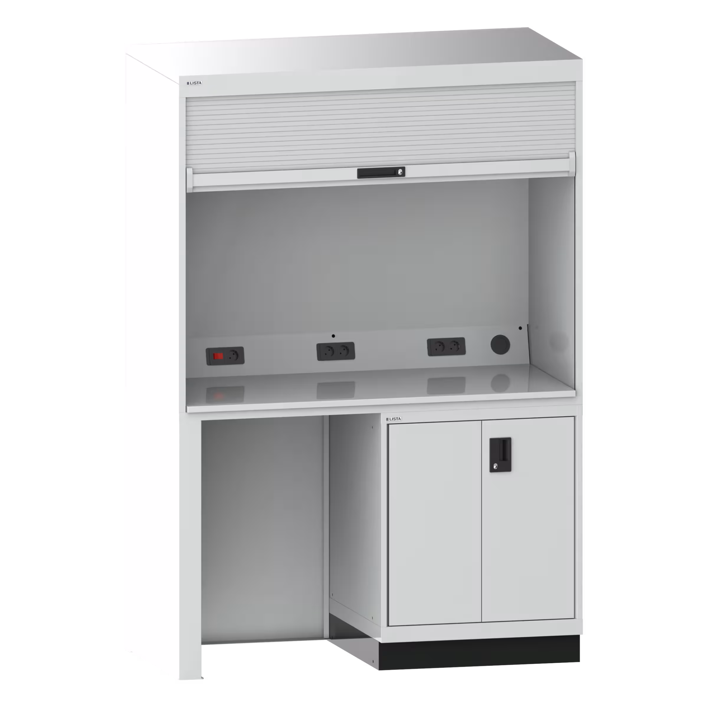 Qualityschrank: Mit Kunststoff-Rollladen inkl. Zylinderschloss, Anschlusskabel 3 m lang, Hartlaminatplatte als Arbeitsfläche, werkzeuglos eingelegt, Elektrifizierung mit 4-fach oder 5-fach Steckdose sowie Kippschalter für die im Gehäusedeckel montierte Leuchte