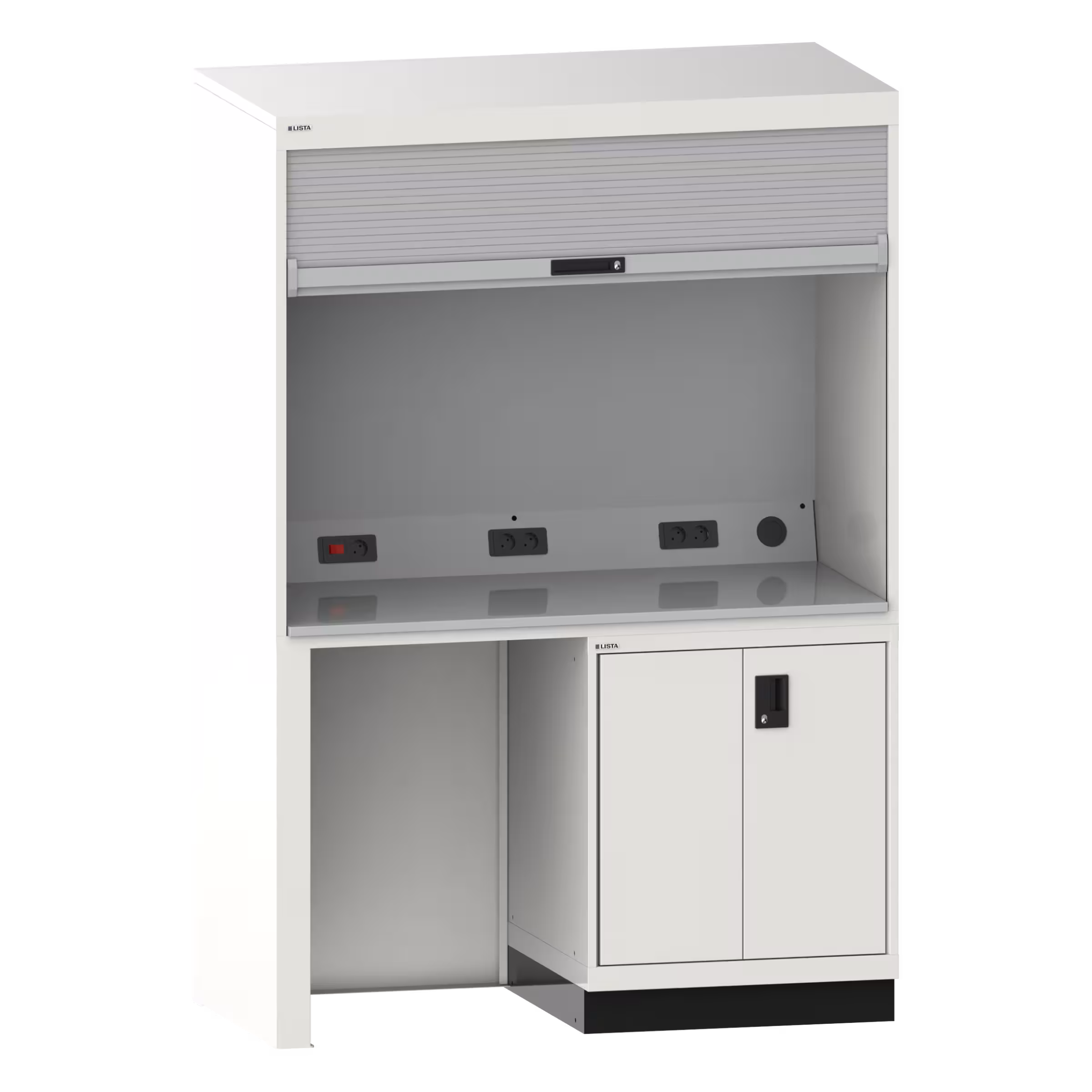 Qualityschrank: Mit Kunststoff-Rollladen inkl. Zylinderschloss, Anschlusskabel 3 m lang, Hartlaminatplatte als Arbeitsfläche, werkzeuglos eingelegt, Elektrifizierung mit 4-fach oder 5-fach Steckdose sowie Kippschalter für die im Gehäusedeckel montierte Leuchte