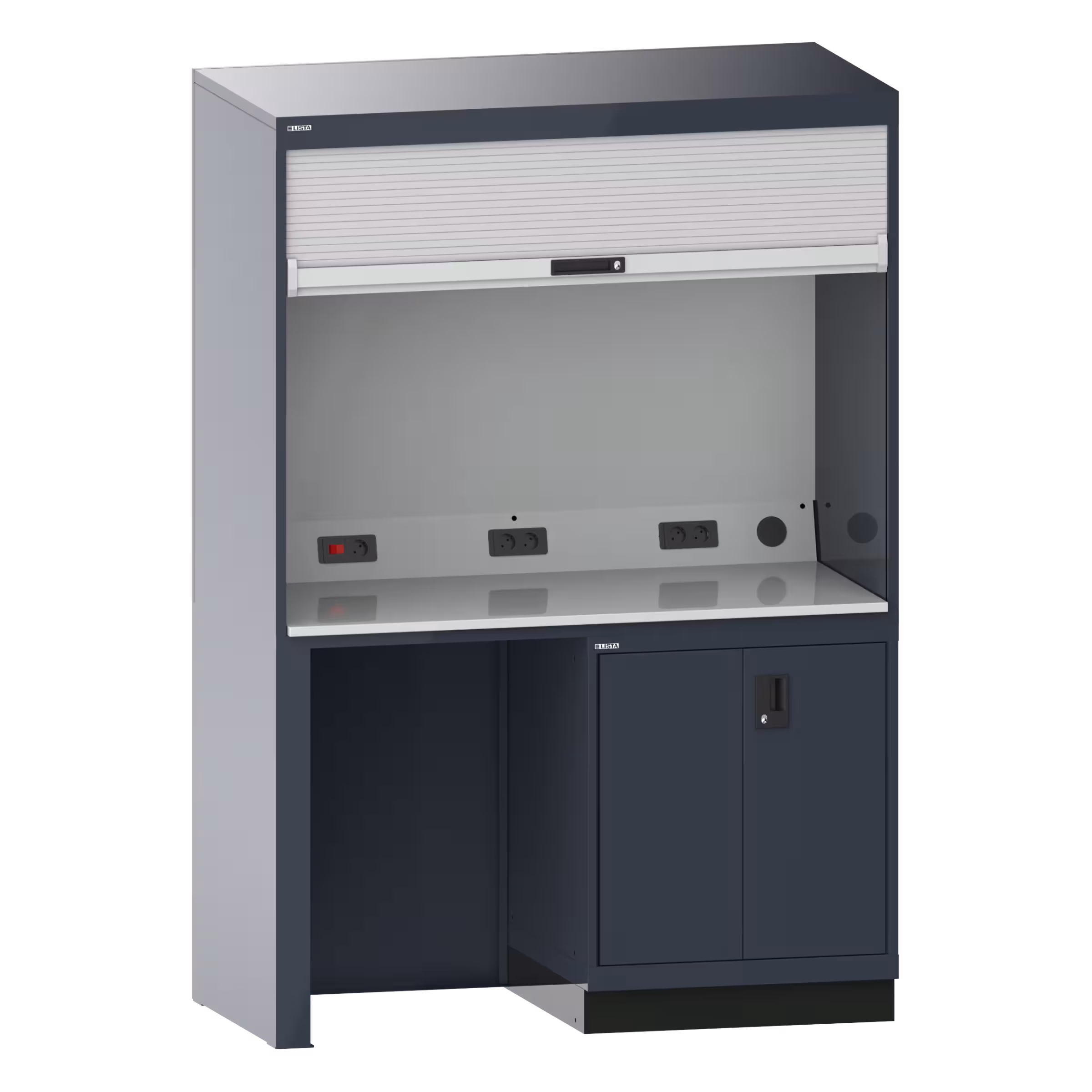Qualityschrank: Mit Kunststoff-Rollladen inkl. Zylinderschloss, Anschlusskabel 3 m lang, Hartlaminatplatte als Arbeitsfläche, werkzeuglos eingelegt, Elektrifizierung mit 4-fach oder 5-fach Steckdose sowie Kippschalter für die im Gehäusedeckel montierte Leuchte