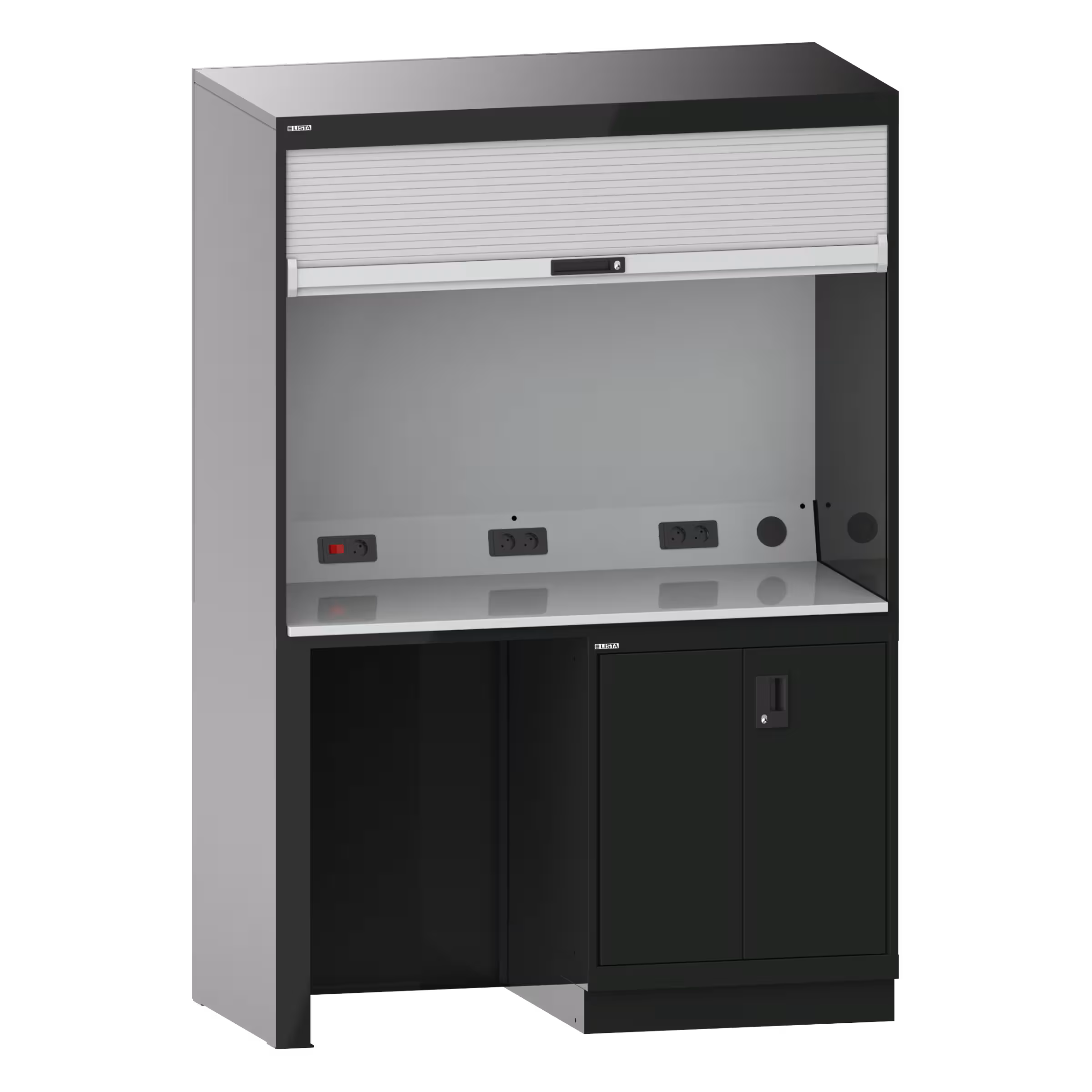 Qualityschrank: Mit Kunststoff-Rollladen inkl. Zylinderschloss, Anschlusskabel 3 m lang, Hartlaminatplatte als Arbeitsfläche, werkzeuglos eingelegt, Elektrifizierung mit 4-fach oder 5-fach Steckdose sowie Kippschalter für die im Gehäusedeckel montierte Leuchte