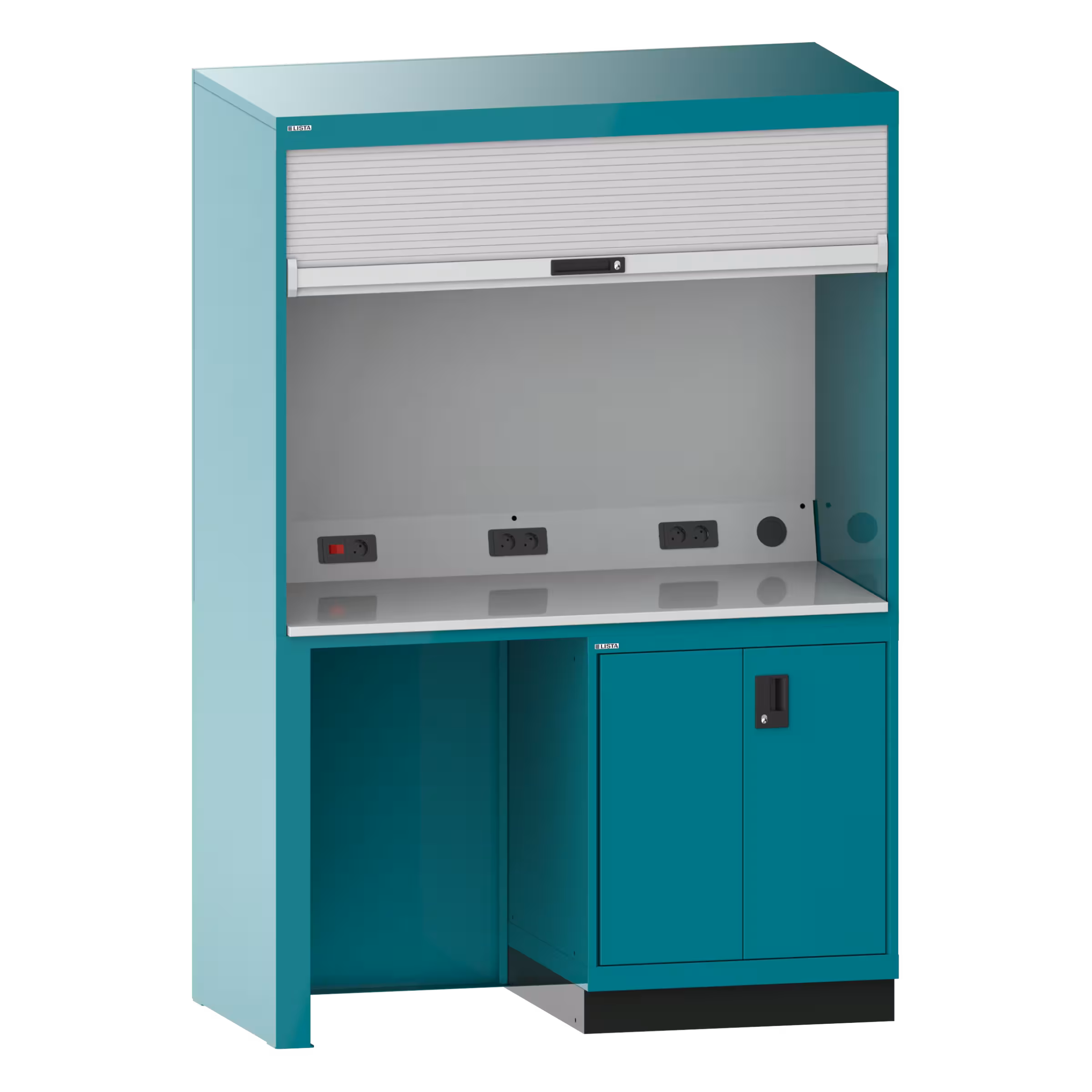 Qualityschrank: Mit Kunststoff-Rollladen inkl. Zylinderschloss, Anschlusskabel 3 m lang, Hartlaminatplatte als Arbeitsfläche, werkzeuglos eingelegt, Elektrifizierung mit 4-fach oder 5-fach Steckdose sowie Kippschalter für die im Gehäusedeckel montierte Leuchte