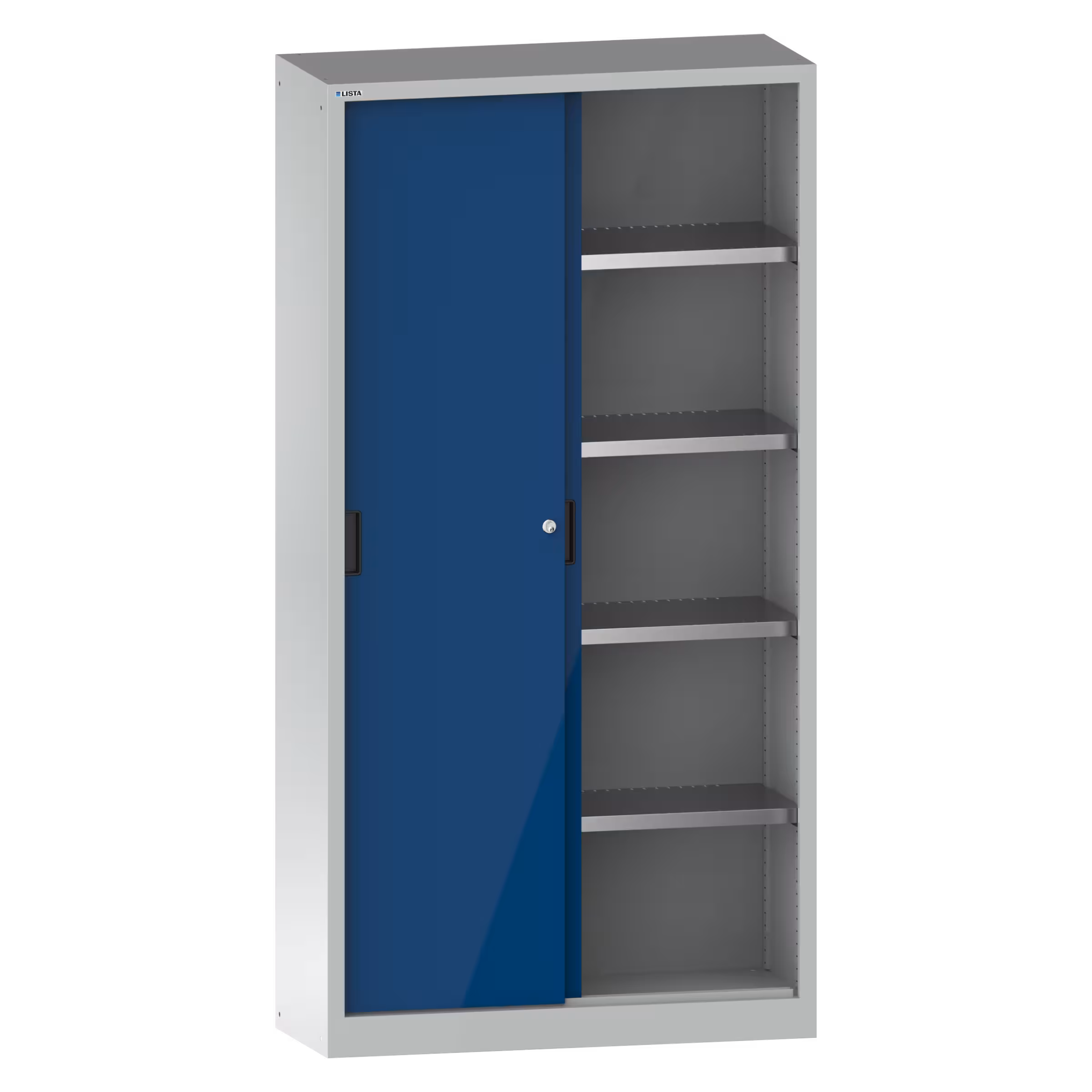 Schiebetürschrank mit 2 Vollblech-Türen (BxTxH) 1250x400x1950mm 4 Verstellböden KEY Lock Lichtgrau RAL 7035 / Signalblau RAL 5005