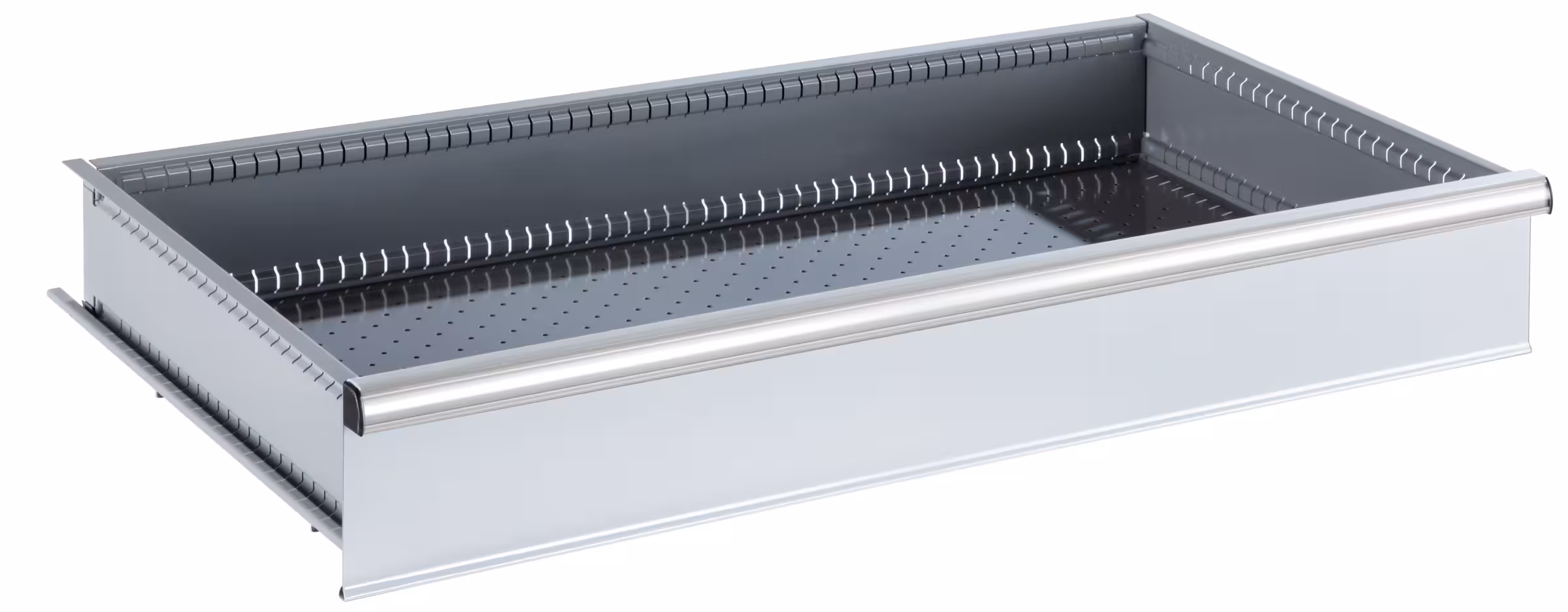 Schubladen: Schubladen verschiedenster Fronthöhen lassen sich inbeliebiger Reihenfolge in das gleiche Schrankgehäuse einbauen. Die Schubladen-Wände sind innen allseitig mit einem Schlitzraster in Einheiten (E) von 17 mm versehen, was eine individuelle Unterteilung ermöglicht. Farbe: Grau, NCS 4502-B.