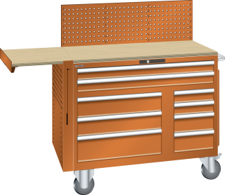 Schubladenschrank Toolbox mobil 64x27E (BxTxH) 1193x630x1450mm 9 Schubladen (64x27E: 2x100, 36x27E: 2x150/1x200, 18x27E: 2x150/2x100) 75kg Gummirollen Ø160mm KEY Lock Orange RAL 2004