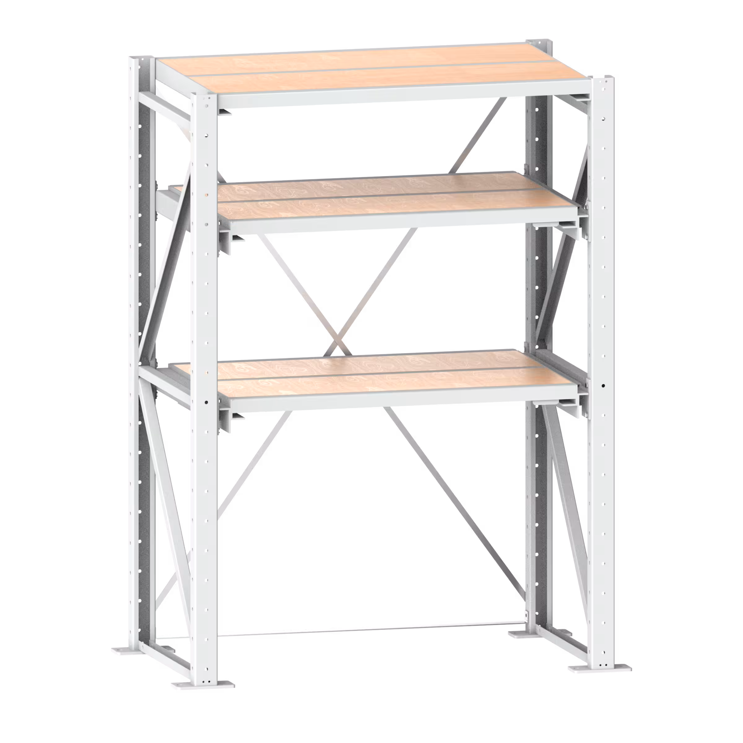 Schwerlast-Auszugregale, zerlegt: Mit 2 Auszugrahmen für Einfachauszug (EA, 65 % ausziehbar) sowie 1 Festrahmen als Kopfboden, jeweils inklusive Spanplatteneinlagen, 40 mm stark. Beliebig mit Seitenwänden, weiteren Auszug- und Festrahmen, Abdeckungen, Schiebetüren, Rollladen und Anfahrschutz ausstattbar. Grundfeld inklusive 1 Diagonalkreuz zur Längsstabilisierung, 2 Ständerrahmen, Bodenverankerung und Nivellierplatten-Set. Anbaufeld inklusive 1 Ständerrahmen, Bodenverankerung und Nivellierplatten-Set. Lochteilung im Ständerrahmen alle 100 mm. Ausführung: Stahlblech. Farbe: gemäss Farbkarte. Hinweis: Ab dem 3. Anbaufeld wird ein zusätzliches Diagonalkreuz benötigt.