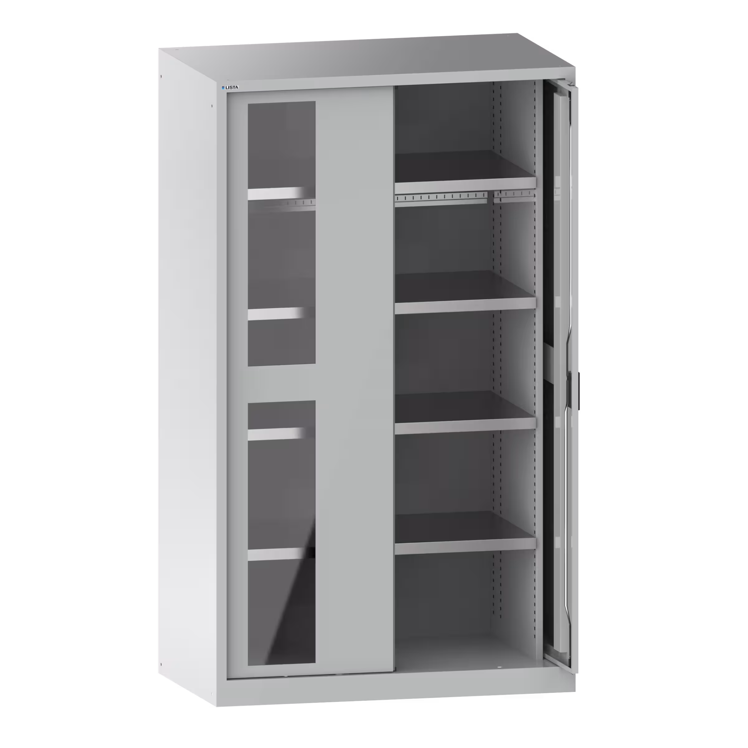 Schwerlastschrank mit 2 Sichtfenster-Einschwenktüren 54x27E (BxTxH) 1146x690x1950mm 4 Verstellböden CODE Lock Lichtgrau RAL 7035