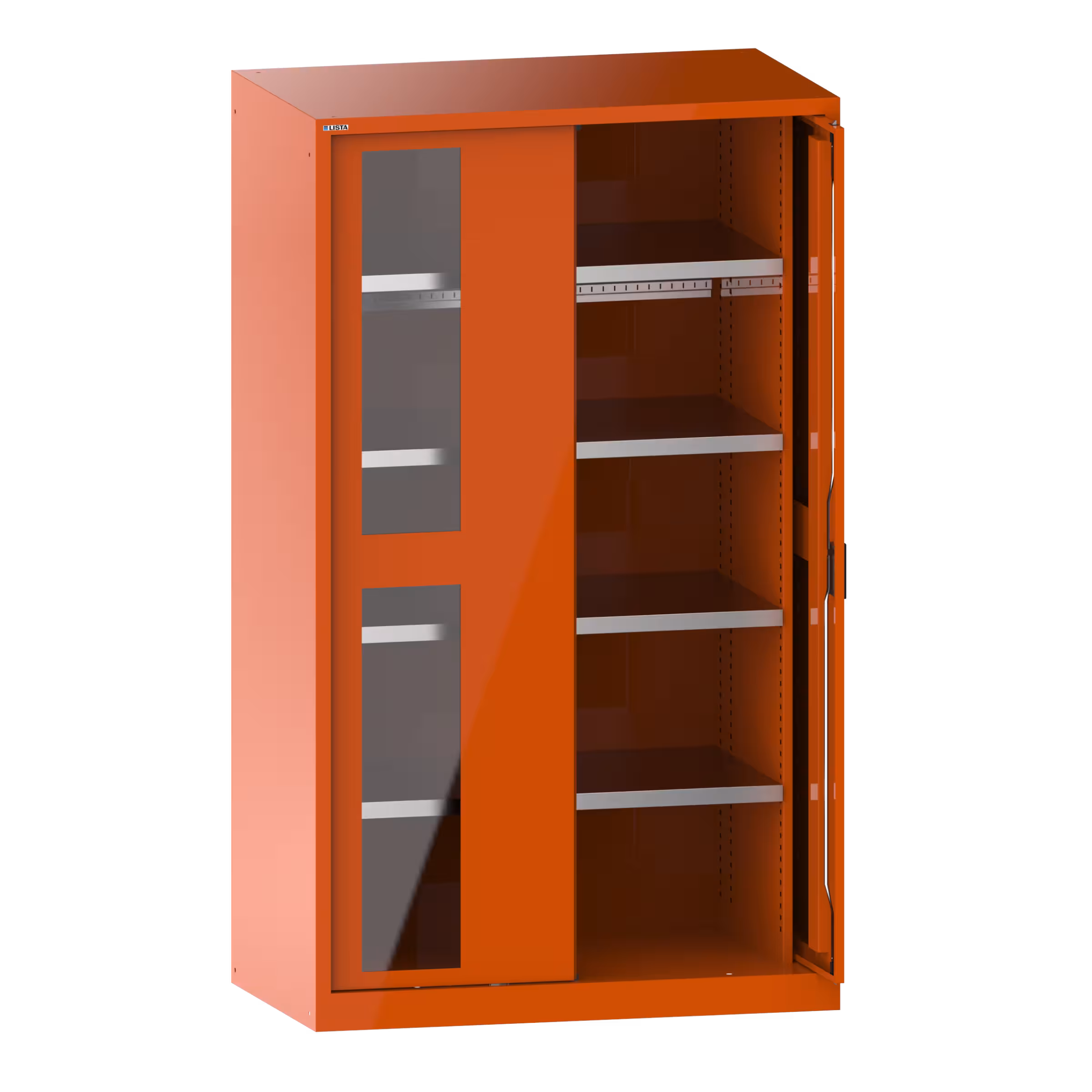 Schwerlastschrank mit 2 Sichtfenster-Einschwenktüren 54x27E (BxTxH) 1146x690x1950mm 4 Verstellböden CODE Lock Orange RAL 2004