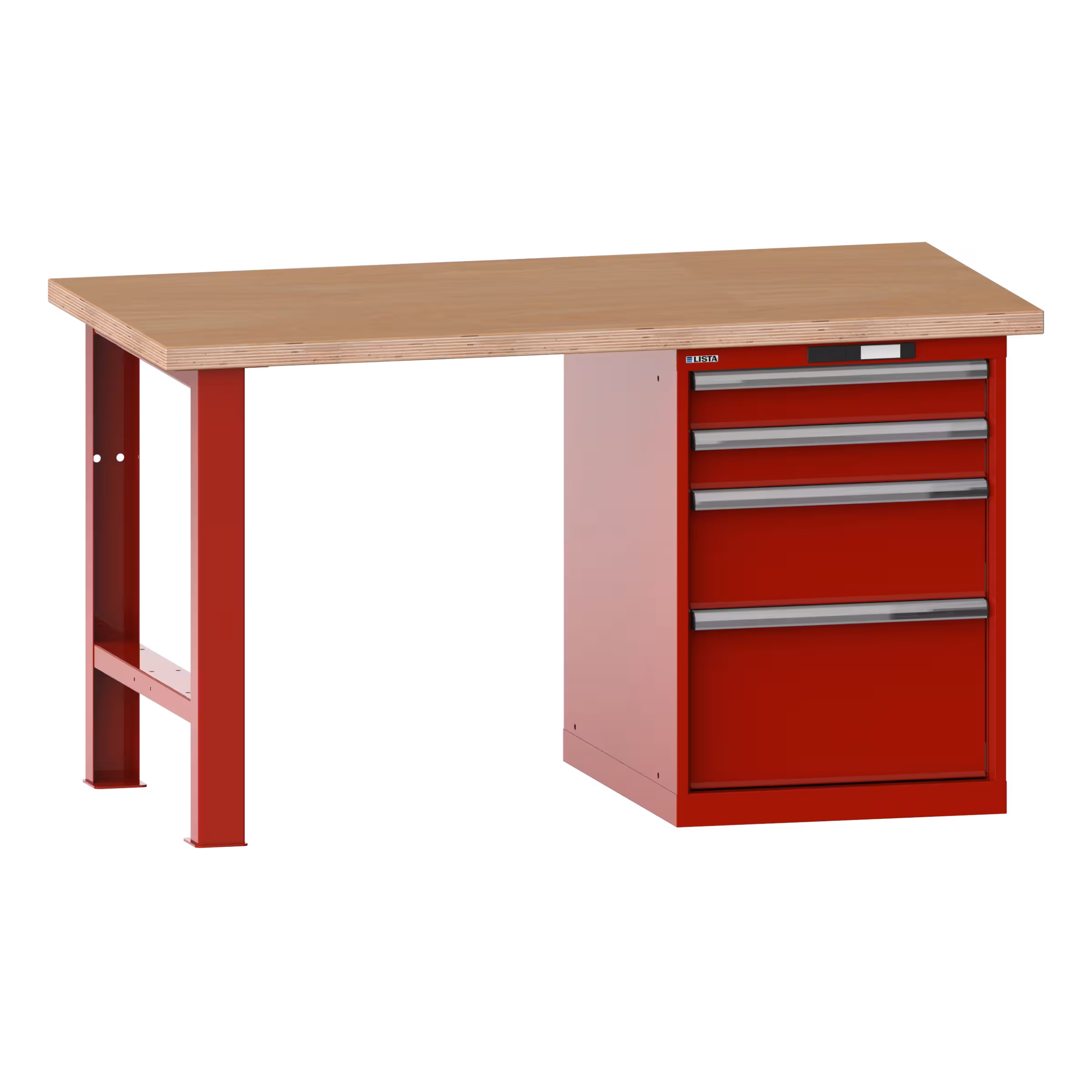 Werkbank 27x27E (BxTxH) 2000x700x840mm 4 Schubladen (2x100/1x200/1x300) 75kg Multiplex RFID Lock Feuerrot RAL 3000