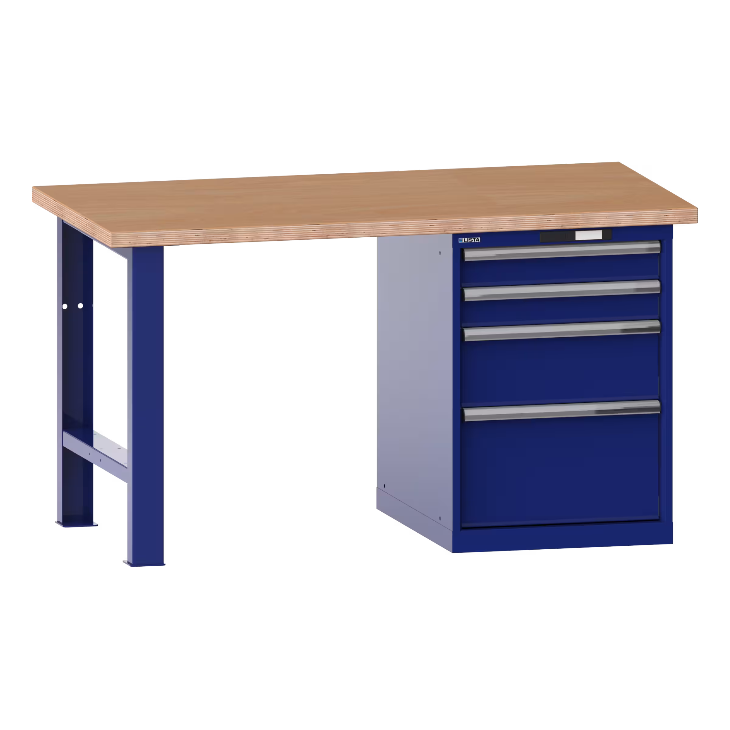 Werkbank 27x27E (BxTxH) 2000x700x840mm 4 Schubladen (2x100/1x200/1x300) 75kg Multiplex RFID Lock Ultramarinblau RAL 5002