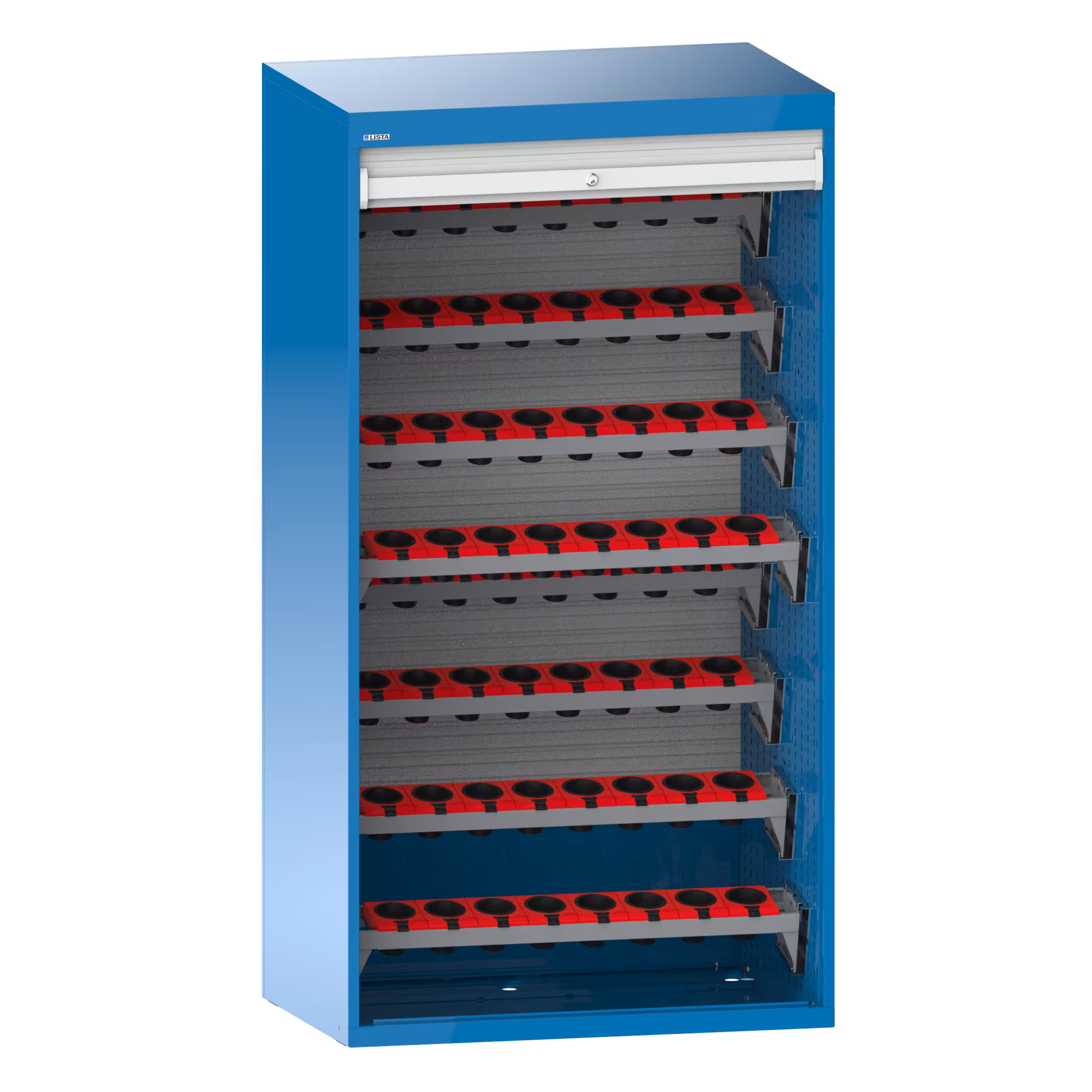 Armoire NC avec rideau 54x27E (LxPxH) 1038x691x1950mm 8 cadres interchangeables, 64 porte-outils ISO-SK 50 KEY Lock Bleu clair RAL 5012