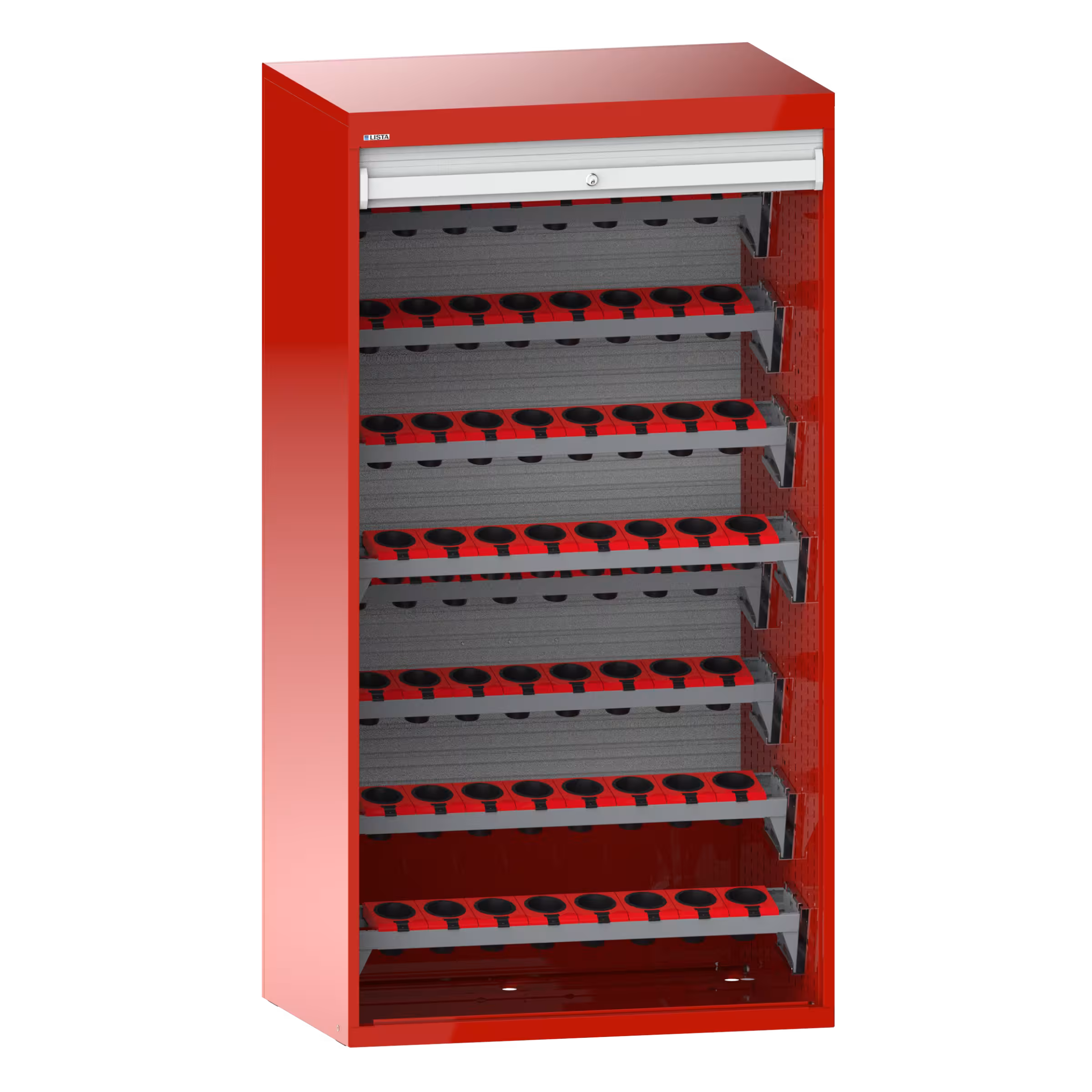 Armoire NC avec rideau 54x27E (LxPxH) 1038x691x1950mm 8 cadres interchangeables, 64 porte-outils ISO-SK 50 KEY Lock Rouge feu RAL 3000