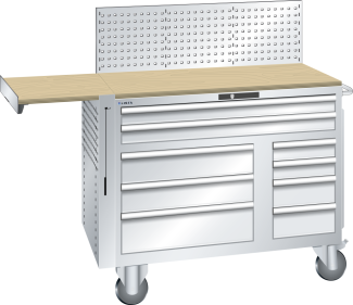 1 plateau de recouvrement en multiplex de 30 mm, 1 barre de poussée, 1 paire de porte-roues avec roulettes en caoutchouc de 160 mm de diamètre, 1 plateau de travail rabattable, 1 paroi arrière perforée, 1 paroi latérale perforée