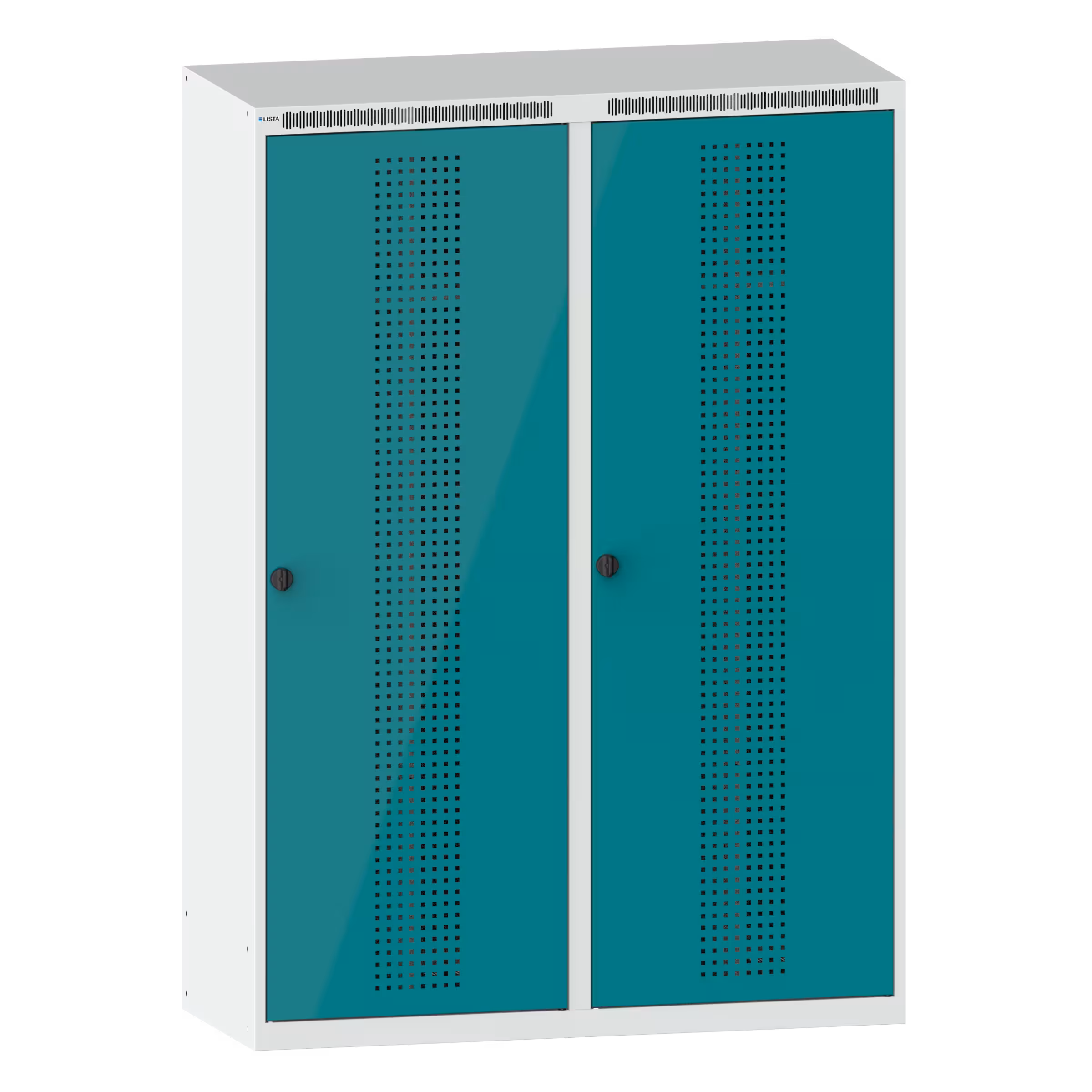 Armoire-vestiaire (LxPxH) 1200x500x1700mm 4 compartiments sans infrastructure, porte perforée, fermeture de sécurité à bouton rotatif Gris clair RAL 7035 / Bleu turquoise RAL 5018