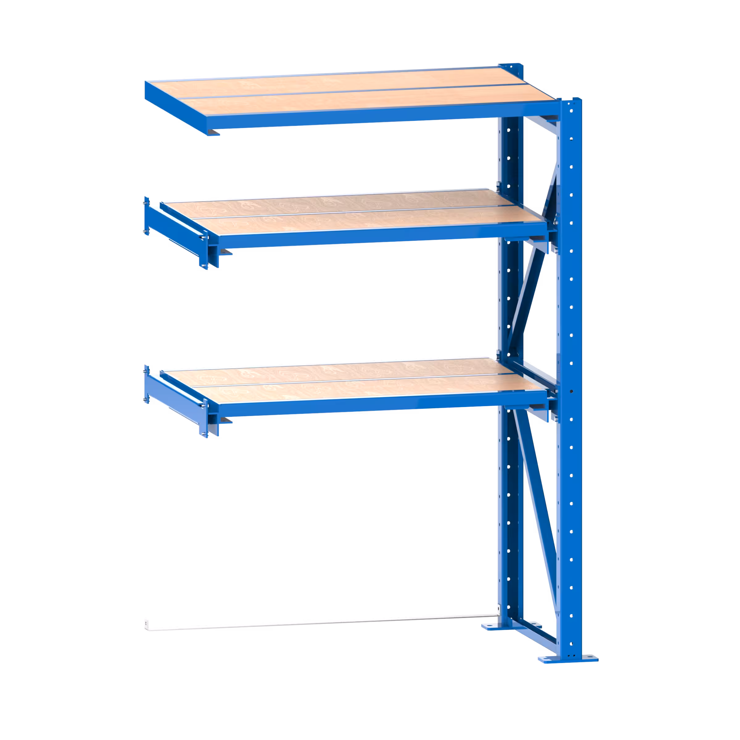 Rayons extensibles charge lourde, non montés: Avec 2 cadres extensibles pour extension simple (ES, 65 %) ainsi qu’un cadre fixe faisant office de montant supérieur, avec panneaux en aggloméré, épaisseur 40 mm. Peuvent être équipés au choix de parois latérales, d’autres cadres extensibles et fixes, de panneaux de couverture, de portes coulissantes, de rideaux et de protections contre les chocs. Unité de base avec 1 croisillon pour la stabilisation longitudinale, 2 cadres porteurs, ancrage au sol et jeu de plaques de nivellement. Unité annexe avec 1 cadre porteur, ancrage au sol et jeu de plaques de nivellement. Trame des fentes dans le montant porteur tous les 100 mm. Exécution : tôle d’acier. Coloris : selon nuancier. Remarque : à partir de la 3e unité annexe, un croisillon supplémentaire est nécessaire.