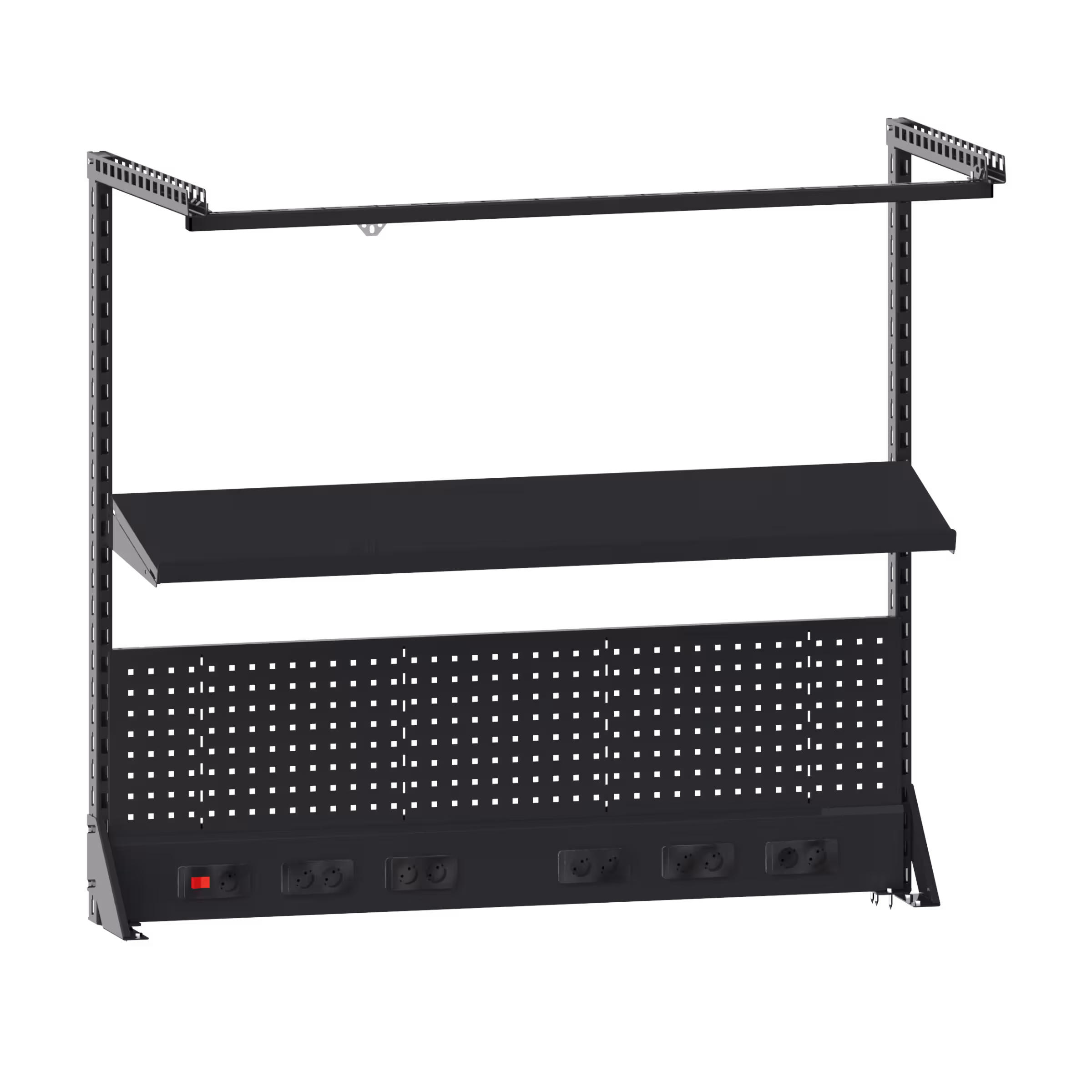 Superstructures universelles pour établis : Les établis et les postes de travail individuels préconfigurés ne contiennent que la superstructure. Possibilité d'extension et de transformation adaptées aux besoins. Les établis et les postes de travail individuels doivent donc être commandés séparément. Hauteur depuis le bord supérieur du plateau. Couleur : selon la planche des couleurs.